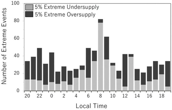 These extreme hourly ramp events are then compared with the extreme oversupply and undersupply events at an hourly timescale within a day. For this study, the total number of 5% most extreme undersupply and oversupply events within each diurnal hour is obtained from FirstGen and PEMC [] and shown in Figure 12. Extreme wind ramp down events are expected to coincide with the hours of the extreme undersupply of energy while extreme ramp-up events are expected to occur at the same hour as extreme oversupply. In Figure 12, except for the 0800, extreme oversupply and undersupply events seemingly occurred randomly within the diurnal cycle and did not appear to match the results of the extreme wind ramp events.
