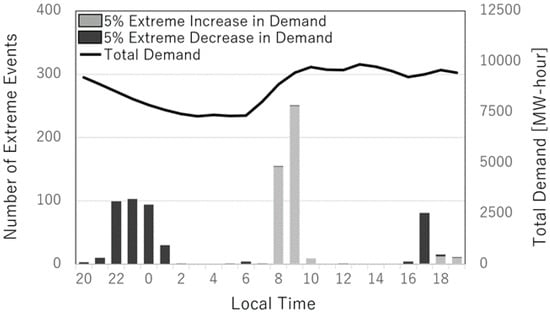 Analyzing the demand of the entire system, extreme increases and decreases in the demand are also summed within the diurnal hours. The expected trend is that extreme decreases in demand occur in the same hour as extreme oversupply of energy, while extreme increases in demand occur together with extreme undersupply of energy. This trend in Figure 13 is consistent, mostly in the morning at around 0800 and 0900. These extreme increases in demand may be associated to the usual behavior of the society wherein people begin utilizing energy as the day begins. The results also find that there was an extreme decrease in demand during 1700 which is often the last hour of work within the Philippine working society. The next decreases in demand occur as the day comes to an end from 2000 to 0100 the following day.