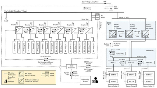 The BESS is formed by three battery strings (BSs), each containing seven battery modules (BMs), each with a 1.2 kWh rated capacity, connected in parallel. The battery management system (BMS) is formed by three battery management units (BMUs) and one master BMU. The BESS power conversion system (PCS), i.e., the system responsible for the AC to direct current (DC) and DC to AC conversion, is formed by three single-phase bidirectional inverters, with one inverter configured as the master device. Both the PV and the BESS inverters are connected to the LV PCC with the main grid.
