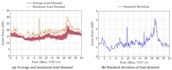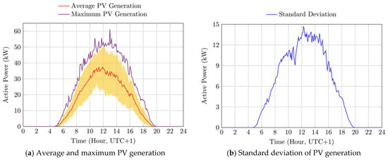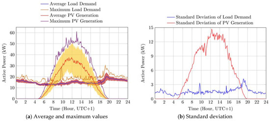 Figure 4a shows the average power demand of loads and the active power generation of the PV system, respectively, for each -th time interval (including the related standard deviation, shown by the red and yellow areas, respectively) and peak power measurements. In Figure 4b, the standard deviation of the measurements for each -th time interval are reported in detail for both of the loads and the PV system.
