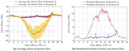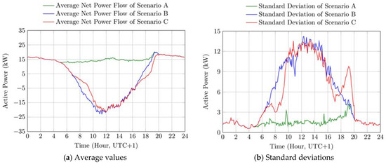 In Figure 7 the active net power flow at the PCC with the main grid for all of the considered scenarios, namely Scenarios A, B, and C, is presented. Figure 7a shows the average active net power flow at the PCC for each -th time interval, while Figure 7b reports the standard deviation of the measurements.