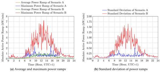 In Figure 6 the absolute power ramp of the active net power flow at the PCC with the main grid for both Scenarios A and B is presented. Figure 6a shows the average value of the absolute power ramp and the related peak power measurements for each -th time interval, while Figure 6b reports the standard deviation of the measurements.
