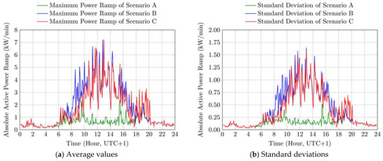 In Figure 8 the absolute power ramp of the active net power flow at the PCC with the main grid for all of the considered scenarios, namely Scenarios A, B, and C, is presented. Figure 8a shows the average value of the absolute power ramp measurements for each -th time interval, while in Figure 8b, the standard deviation of the measurements is reported.