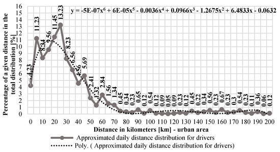 Daily distance distribution for ICEVs, PHEVs, and BEVs operating in urban mode—approximate value based on experimental studies.