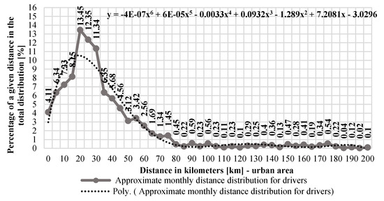Monthly distance distribution for ICEVs, PHEVs, and BEVs operated in urban mode—approximate value based on experimental tests.