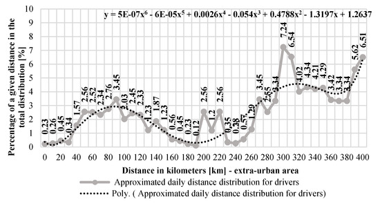 Daily distance distribution for ICEVs, PHEVs, and BEVs operated in extraurban mode—approximate value based on experimental tests.