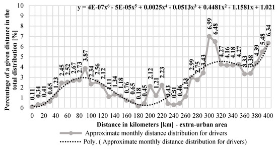 Monthly distance distribution for ICEVs, PHEVs, and BEVs operated in extraurban mode—approximate value based on experimental tests.
