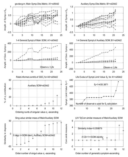 The multidimensional nature of the inefficiency space in machine operation monitoring is now well defined and analyzed in terms of existing model errors through the use of neural networks [65], singular value decomposition [66], or principal component analysis [67]. A more difficult task is the multidimensional decision-making process, where we have a data fusion method [68] and the concept of symptom reliability applied to a general failure obtained by using singular value decomposition (SVD) [69]. Based on the model presented in the above publications, a generalization of the SVD method was used. It considers other SOMs of similar objects with the same number of symptoms (columns); however, the number of rows (observations) may differ [70,71]. The intelligent model learning has been applied [72,73,74]. The GSVD concept based on a prior SVD application has been used until initial results can be seen as possible use of the GSVD in machine condition monitoring, especially when looking for similar symptoms and wear based on aperiodic damage in the entire energy system in ICEVs, PHEVs, and BEVs [75,76,77]. An example of the use of the model has been shown in Figure 6, which shows the results of using the model for a diesel engine.