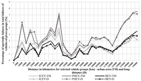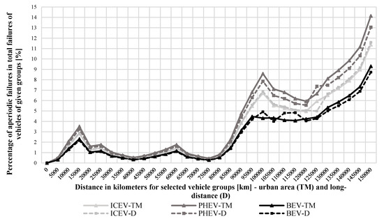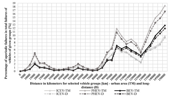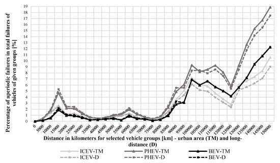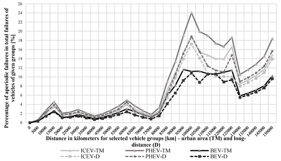 Distribution of aperiodic failures for a medium multiperson vehicle with ICEV, PHEV, and BEV propulsion for urban and long-distance speed profiles over a distance of 150,000 km.
