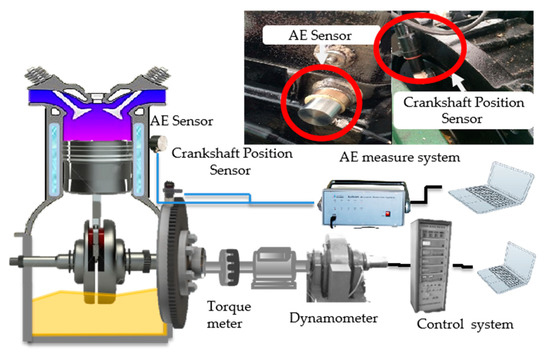 The AE sensor was verified by the manufacturer before tests where the AE response of pencil-lead breaks on the engine housing was observed. Because the output voltage signal of the AE sensor is sometimes as low as a few microvolts. The signals are processed by a pre-amplifier (the magnification is 40 dB). The acoustic emission detector is the SEAU2S–1016-08 acoustic emission detector of Beijing Shenghua Industrial Technology Co., Ltd. (Beijing, China). The sampling length is up to 128 k sampling points under 16-bit precision.