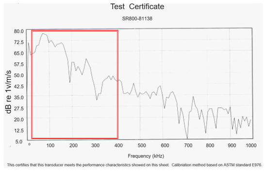 The AE sensor was located closer to the contact part between the outer cylinder wall and the liner. The crankshaft position sensor is an electronic device located on the flywheel housing. A crank angle signal was measured by crankshaft position sensor 39180 (Hyundai Mobis, Seoul, Korea) at the same time to record the TDC (top dead center) of each revolution. The AE measurement system is composed of the AE sensor, pre-amplifier, AE detector, and PC. The wideband piezoelectric AE sensor (model SR800, Qing Cheng AE Institute, Guangzhou, China) was selected to acquire AE signals because this sensor has a good frequency response in the band from 20 and 400 kHz according to the calibration chart as shown in Figure 2. A number of trial tests also showed that AE signals of interest were more significant below 250 kHz on engine surfaces. Therefore, the frequency band in this study was focused around 20 to 400 kHz.