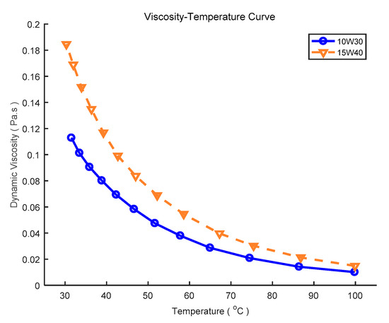 The viscosity–temperature curve of two tested lubricating oils.