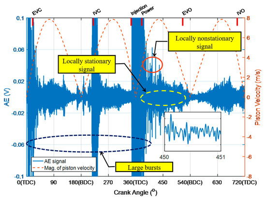 Figure 4 presents typical AE signals and the varying piston speed profile in the angular domain for an engine working cycle. The piston speed reaches its maximum in each middle stroke and decreases to zero at the top dead center (TDC) and bottom dead center (BDC). The large AE events to be attributed sequentially to the excitations of exhaust valve closing (EVC), inlet valve closing (IVC), fuel injection, combustion shocks, exhaust valve open (EVO), and inlet valve opening (IVO). Each of them exhibits strong AE bursts and reflects the short impulses of the sources. Between the strong bursts, there is nothing moving components except for piston assembly in the single-engine. It is worth noting that there are local stationary waves in the middle of each stroke. The amplitude of these stationary waves varied with the piston speed, displaying a close association with the FAS effects suggested in [42,44]. Within the same local range, some locally nonstationary signals are generated stochastically. The locally stochastical AE peaks varied with piston speed are related to the asperity–asperity collision based on the AAC model of the BL lubrication regimes.