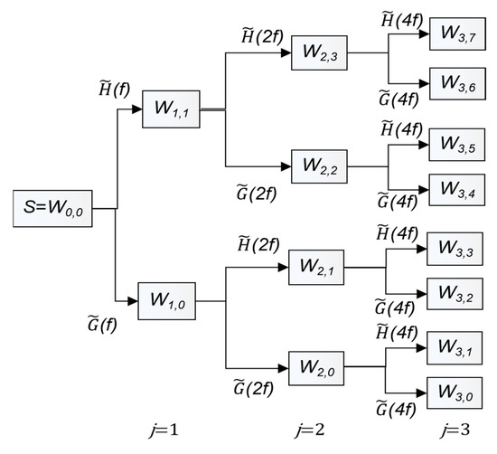 Figure 5 presents a full wavelet packet tree down to level 3. The terminal nodes approximate bandpass filters of the form at the j level of the wavelet packet transform is , where Fs is the sampling frequency. The orthogonal wavelet decomposition procedure separates the coefficients into two parts using the high pass filter and the low pass filter .