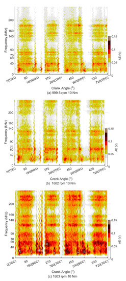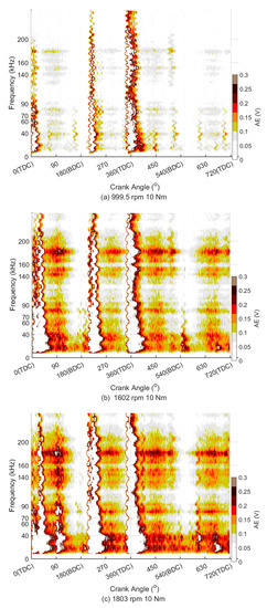 To verify the effectiveness of AE thresholds to extract FAS–AE, WPT spectra of raw AE and threshold–AE are calculated for all different tested cases using db5 wavelet. The decomposition level for WPT is level 8 for a trial and error test. Figure 6 and Figure 7 show the typical WPT spectra for the baseline pure diesel with the lube-oil 10W30 running at different speeds at 10 Nm. In both above two figures, it can find some semi-continuous distinguished peaks in four discrete frequency bands: 40–60 kHz, 70–90 kHz, 140–160 kHz, and 170–190 kHz. These AE events that emerged around each middle stroke in narrow frequency bands are correlating to FAS–AE according to the analysis of Section 3.1.