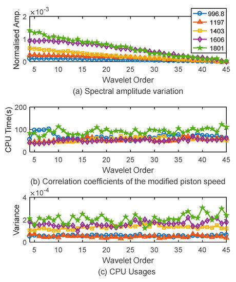 In Figure 8, the average correlation amplitudes for different wavelet orders decline with the order increase and the correlation coefficients with the piston speed show very slight variations with the order increase. Therefore ‘db4’ is the maximal amplitudes with a shorter time for all the cases explored. Considering a slightly better smooth effect at the high order, the wavelet decomposition order is selected as ‘db5’ for further WP analysis in this study.