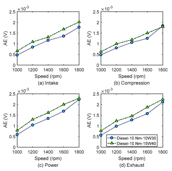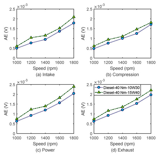 Figure 10 and Figure 11 show the differences of FAS–AE indicators between two baselines: 15W40 and 10W30. AE signals for 15W40 oil with higher viscosity exhibit greater amplitudes than 10W30 with lower viscosity. It shows that AE signals are sufficiently sensitive to small changes in the properties of lubricants. Therefore, they can be based to detect and diagnose the FAS–AE effects of alternative fuels on engines.
