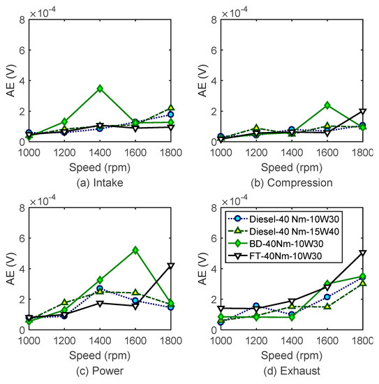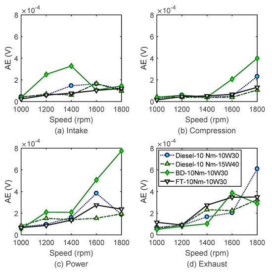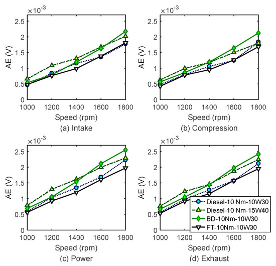 Figure 12 and Figure 13 show the comparison of FAS–AE between different fuels under the two engine loads respectively. The AE responses of F–T diesel are similar to the diesel with the same type of lubricating oil (10W30) during all the strokes, except for power stoke under 10 Nm with tiny lower amplitudes than diesel. The FAS–AE indicators of biodiesel show higher amplitudes than the diesel with 10W30 oil. The AE indicators are similar to the diesel with 15W40 oil even with a higher response up to 1600 rpm under 10 Nm. It indicates that these two alternative fuels produce little negative influences on FAS effects for most operating conditions.