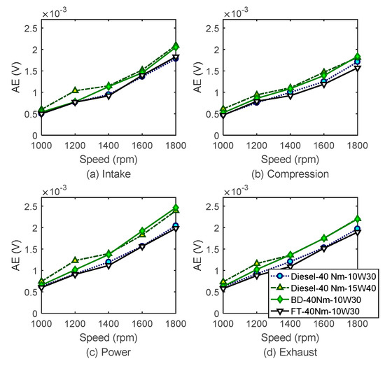 Figure 14 and Figure 15 show the AAC–AE indicators of different alternative fuels under different loads. The AAC–AE trends are unstable at speeds. Especially, the AAC–AE of biodiesel has high values in the power stroke and exhaust stroke. This can indicate that the combustions of these alternative fuels are less perfect. Reference [47] suggested that the particles fuelling biodiesel were higher than fuelling diesel. The particles generate immediately after combustion in which the instantaneous temperatures are relatively high. Hence, more AAC effects are caused by the particles adhered to the lubrication surfaces. Therefore, between the two alternative fuels, biodiesel produces more impact because it has higher AAC–AE responses, which occur at high speeds due to high temperatures.