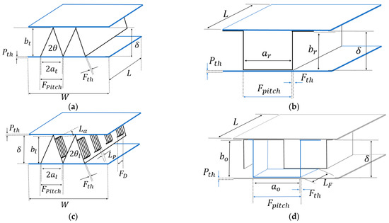 Geometry of finned surfaces: (a) triangular, (b) rectangular, (c) louvered, (d) offset strip-fin.