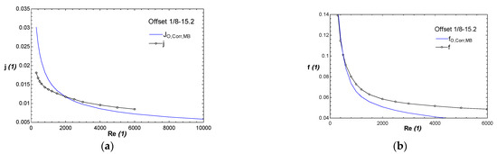 Experimental vs correlation calculations for offset 1/8-15.2. (a) Colburn factor Equation (41), (b) friction factor Equation (45).