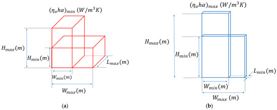 Finally, for the offset strip-fin, the volume boundaries were and . To achieve an aspect ratio of 1, the width could only be modified within the range of W = 0.58 m to 0.55 m. The corresponding lengths and free flow areas were L = 0.28 m and 0.10 m2 and L = 3.59 m, and the free flow area was 0.13 m2. Figure 5 shows the volume design region for the case of study using offset strip-fins.