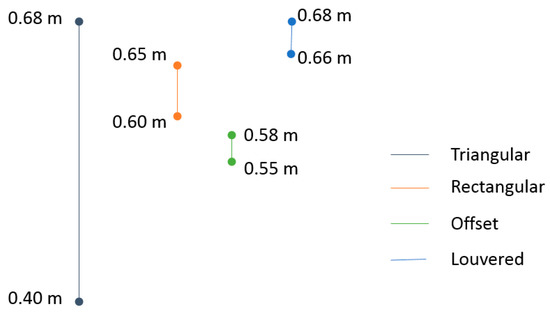 As mentioned above, the specification of the plate width fixed the plate height; with this, the shape of the frontal area (aspect ratio) could be accommodated to the desired dimensions. For a near 1 aspect ratio, Figure 6 depicts the upper and lower limits for a feasible solution for the different fin types. The information in the diagram showed that certain width values could be achieved by proper selection of the fin-type. For instance, if it was desired to have an exchanger width between 0.55 m and 0.58 m, such dimension could only be achieved using triangular and offset fins.