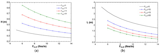 For a width W = 0.75 m, an analysis of the variation of the heat exchanger height and length as a function of fin density was carried out. Figure 7a shows the case of the maximised pressure drop (cold stream). As could be seen, when the fin density increased, the height also increased, but the flow length was reduced. When the fin density increased the pressure drop across the heat exchanger also increased; in this sense, the fin density controlled the heat exchanger dimensions. Then, the fin density could be chosen so that the required dimensions were satisfied without compromising the length in terms of space limitations.