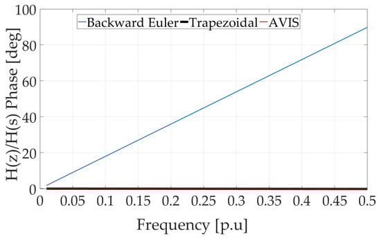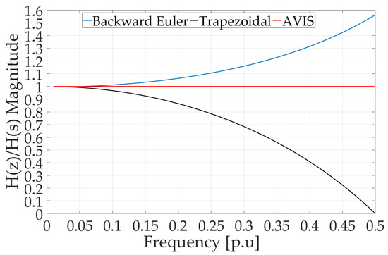 The ratio for the considered integration methods is shown in Figure 3 and Figure 4. In these figures, the frequency axis is labeled based on the per unit system, so the Nyquist frequency .