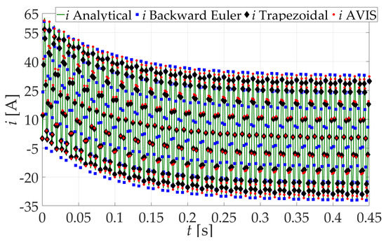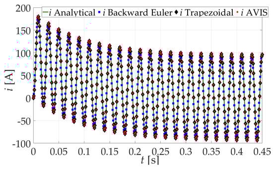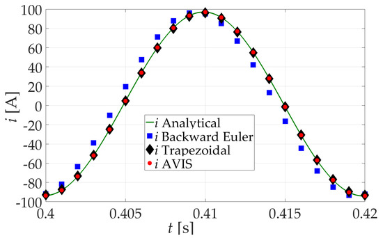 When analyzing the results of simulation experiments, it can be seen that for the integration step = 1 ms, regardless of the frequency of the supply voltage, the most accurate results are obtained using the AVIS method for the approximation of differential equations. Discrete values of solutions coincide with the exact solution. This also confirms the correctness of the results presented in Figure 3 and Figure 4. With the use of the trapezoidal method for a voltage excitation with a frequency of 50 Hz, the results are also satisfactory, but for a frequency of 150 Hz, there is clearly a difference in relation to the exact solution (there is an amplitude error). The use of the backward Euler method in both cases (50 Hz and 150 Hz) causes clear differences in relation to the exact solution.