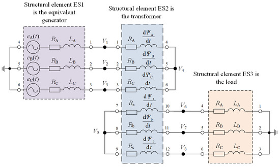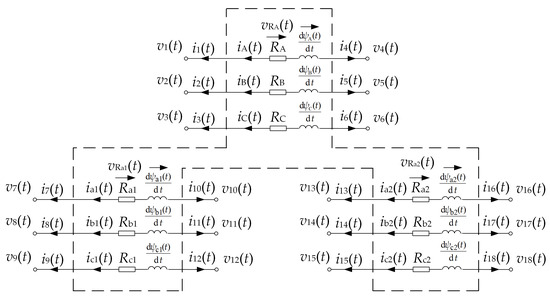 Using the mathematical modeling convention presented in [31], Figure 14 shows a diagram of a three-winding three-phase transformer as a structural element (eighteen-pole device).