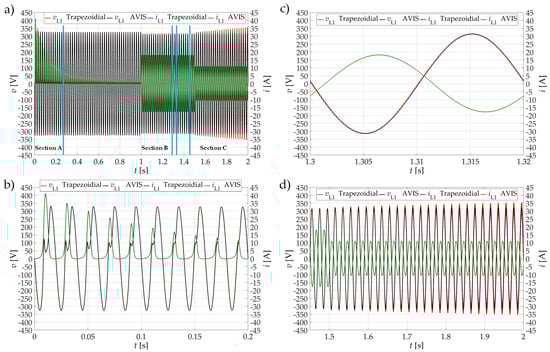 Time waveforms: (a) voltage in phase L1 and phase current in winding of phase L1 of a power transformer using the trapezoidal method and the AVIS method (three sections with details have been marked: (b) section A, (c) section B and (d) section C).