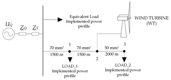 The digital simulator is to map the operating states of the medium voltage power line, which supplies the technological park with two main power connections. A Vestas V90 wind turbine (WT) with a rated power of 1.8 MW is also connected to this line. Only this fragment of the MV power distribution network was considered, because its operation is managed by the technology park. The diagram of the analyzed medium voltage distribution line with a wind farm is shown in Figure 11.