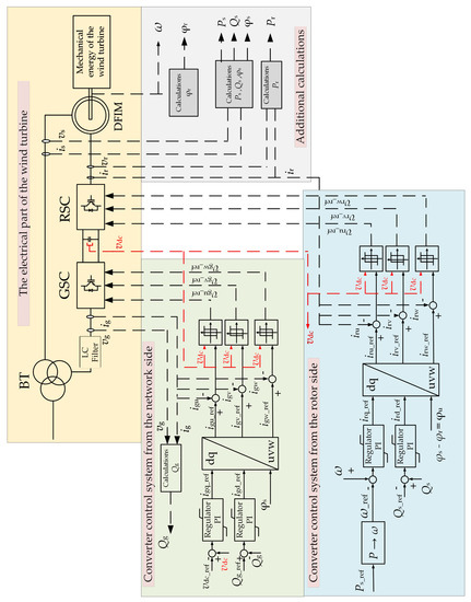 The schematic diagram of the modeled wind turbine with the control system is shown in Figure 12. The electrical part of a wind turbine (WT) consists of the following main elements: a double-fed machine (DFIM); rotor side converter (RSC); mains side converter (GSC); LC filter; three-winding block transformer (TB); the converter control system from the rotor side (RSC) and the converter control system from the network side (GSC). The characteristics of the control system were taken from the literature [9,39].
