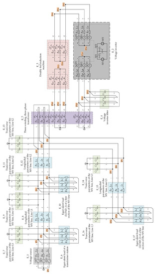 An equivalent diagram of the analyzed fragment of the MV power distribution network in the form of a connection system of electric multipole poles is shown in Figure 13. In this way, seventeen structural elements were distinguished, the names of which are written directly in Figure 13. This diagram is the basis for the development of a mathematical model of this power system.