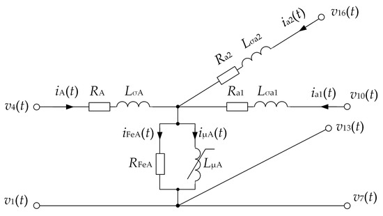 The three-winding, three-phase transformer consists of a three-column ferromagnetic core; on each column, there is placed one upper voltage winding (phase indexes A, B, C) and two lower voltage windings (phase indexes: a1, b1, c1 and a2, b2, c2, respectively). When creating the mathematical model of the transformer, the losses in the core, nonlinear magnetization characteristics and losses in structural elements were all taken into account. A suitable schematic diagram for one phase of the transformer is shown in Figure 15.