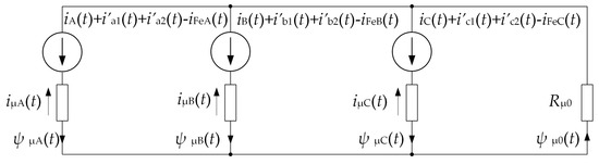 The full mathematical model of a three-winding, three-phase transformer requires supplementing the matrix Equation (7) with equations describing the magnetic circuit. For this purpose, a surrogate diagram of the magnetic circuit of the modeled transformer was constructed, as shown in Figure 16.
