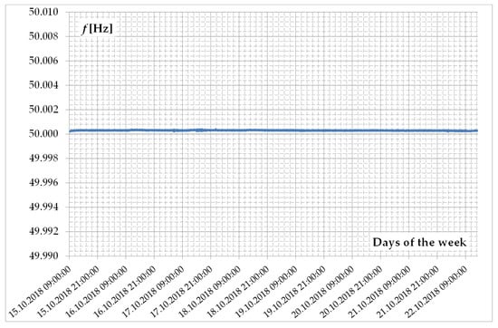 After the experiment was completed, results were obtained that enable the analysis of the simulator’s work. First, the voltage frequency at the measuring point was analyzed during the experiment. The voltage frequency changes are shown in Figure 18. The average frequency value recorded by the network parameter analyzer is 50.0003 Hz. The recorded voltage frequency values and the average value are proof that the developed simulator is stable throughout the experiment and that the quantum of the simulator’s operation time has been correctly selected. If the quantum of the simulator’s operation time was incorrect (if it was too long, the simulator could not keep up with the calculations), as a result of the simulator’s operation, deviations from the value of 50 Hz would be recorded. A similar result would be obtained in the case of stability of the simulation. If there were any problems with stability, then the voltage frequency deviations from 50 Hz would also be recorded.