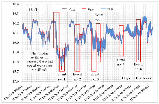 The course of effective values of phase-to-phase voltages in PCC is shown in Figure 19. When analyzing the course, it can be observed that changes in voltage values are caused by changing loads of three distinguished loads (active and reactive power profiles), changes resulting from changing wind speed (wind turbine operation) and changes caused by random events. Analyzing in detail the obtained waveforms and events recorded by the analyzer, it is possible to distinguish characteristic operating states, which are marked in Figure 19 by appropriate rectangles (red). The event numbers used in this figure correspond to the numbering used in Table 3.