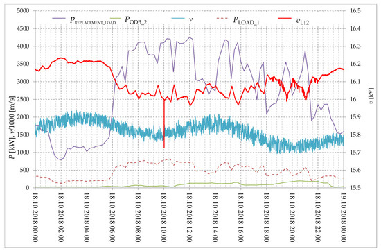 Figure 20 shows the phase-to-phase voltage variability (L1-L2) at the connection point of the generating unit to the network, registered on 18 October 2018, taking into account the variability of active load power in the analyzed MV distribution network and changes in wind speed. Analyzing these waveforms, three characteristic states can be distinguished. The first of them lasts from to hours. During this period, the load works with relatively low power, while the wind turbine works with the rated power, because the wind speed exceeds 14 m/s. Thus, the voltage variation in the network is caused by changing values of load power, but to a relatively small extent.