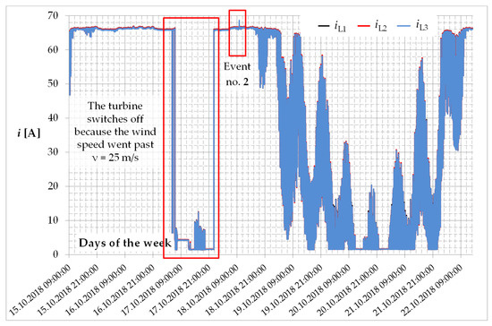 In further analysis, selected fragments of current waveforms and power generated by the wind turbine for MV distribution network (shown in Figure 21 and Figure 22, respectively) will be considered in detail. From current waveforms, it can be seen that the effective values of currents do not change when the generating unit is working with a constant power value (wind speed higher than the rated speed for Vestas V90 is 14 m/s). In the periods from 16 October 2018 from midnight and 18 October 2018 from a.m., the wind turbine generate electricity with a nominal power of 1.8 MW.