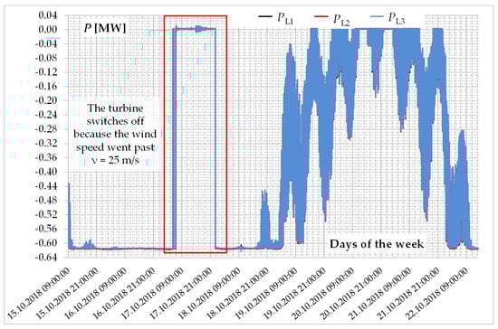 On 17.10.2018, the wind speed exceeded the maximum value for the operation of the wind turbine (v > 25 m/s); therefore, it was turned off. Of course, the value of active power decreased from 1.8 MW to 0 MW (Figure 22), and the effective current value decreased from 66.0 A to 4.0 A (Figure 21). Such changes have a large impact on the voltage value at the node connecting the generating unit to the network (PCC) (Figure 19), as mentioned earlier.