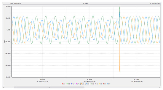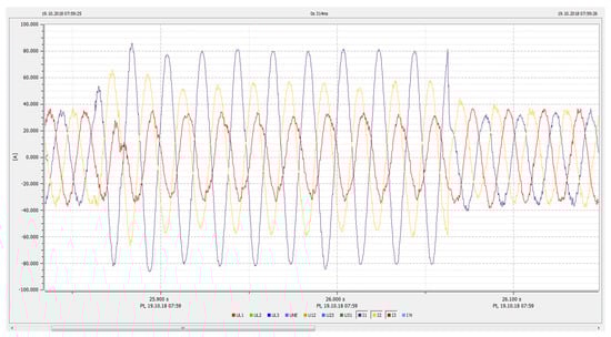 Figure 23 and Figure 24 present waveforms of instantaneous voltages and currents recorded by the PQ-Box during a phase-to-phase short circuit. Figure 23 shows the phase-to-phase voltage waveforms at the generating unit connection node, while Figure 24 shows the waveforms of the block transformer line currents during the phase-to-phase short-circuit (between phases L1 and L2) in acceptance 1 (LOAD_1). The occurrence of a phase-to-phase short circuit in LOAD_1 caused an increase in the wire current in the MV windings of transforme of the generating unit in the L1 and L2 phases. Due to the relatively short fault time, the drawings show the waveforms that characterize the entire process.