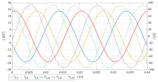 Figure 25 shows the time history of phase-to-phase voltages in PCC and the wire currents of the wind turbine transformer on the MV side during normal operation (steady state). The generating unit works with rated power. The phase shift between phase-to-phase voltage and current is approximately 5/6. The asynchronous ring machine works as a generator. Analyzing the course, it can be observed that the quantum of the simulator operation time was correctly selected. This is evidenced by the fact that the frequency of the presented signal is equal to 50 Hz.