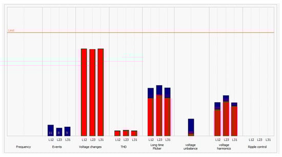Finally, the option of automatically generating a report on the assessment of voltage (electricity) quality at the connection point of the generating unit to the MV distribution network was used, in accordance with the requirements of the PN-EN-50160 standard. This report is presented graphically in Figure 26. The horizontal line corresponds to the limit values for each parameter. Red bars are the parameter values that are not exceeded for 95% of the measurement time; dark blue bars are the maximum value from the set of values averaged during the measurement period. Analyzing the presented results, it can be stated that the quality parameters of electricity in accordance with the standard are met in the node connecting the generating unit to the MV network.