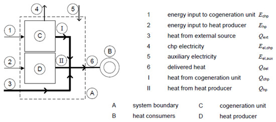 As mentioned above, the EHP association developed guidelines for evaluation of DHC, through the Ecoheat4cities project [13]. This considers as system boundaries on one side the primary energy input to the production, including all kinds of thermal energy production plants, comprising also cogeneration and waste energy recovery, and on the other side the energy transfer devices included in the building/client substation. The evaluation scheme proposed in the Ecohet4cities guidelines is shown in Figure 1.