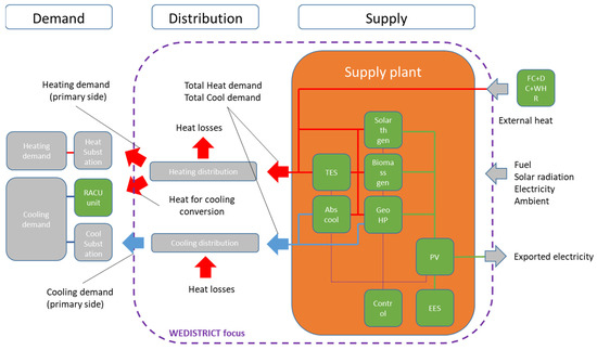 It should be noted that renewable energy produced by an energy carrier (, , and ) are considered for on-site harvesting of solar, wind, hydro, or ambient energies. The equations effectively consider these renewable energy sources as having a renewable primary energy factor of “1”. In contrast, the rest of carriers, which include biofuels and electricity, are considered to have a non-renewable part, hence the corresponding renewable and total primary energy factors are used. Moreover, the energy exports, such as eventual excess of PV or CHP electricity, are considered to compensate the total primary energy use of the DHC with a primary energy factor equivalent to the network carrier.