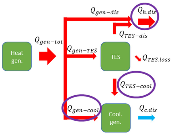 where : Cooling share (-); : Heat supplied by the generator equipment to the cooling generation equipment in the plant side of the district (kWh); : Heat supplied by the thermal energy storage equipment to the cooling generation equipment in the plant side of the district (kWh) and : Heat supplied to the heating distribution network (kWh).