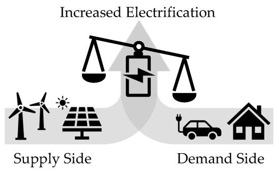 Europe and the rest of the world are forging a path towards a low-carbon future by establishing targets for drastically reduced environmental impacts as described in the Paris Agreement [1]. Clean, renewable sources like wind and solar energy must be used, in combination with the electrification of sectors of activity, to reach international sustainability targets [2,3,4]. However, the transition from fossil fuels to low-carbon energy sources is hindered by the ever-increasing global demand for energy [5] as well as the lack of reliability of renewable sources. Apart from the obvious transition on the supply side, the transition to a low-carbon society will also require that the traditional processes on the demand side, like transportation, be electrified (Figure 1) [6,7]. As increased electrification causes high stress on the electrical grid, there is a need for either an expansion or upgrade of the electrical grid or measures to compensate for imbalances between supply and demand [8,9]. The buffer capacities of today’s electrical grids are not able to handle this challenge [10].