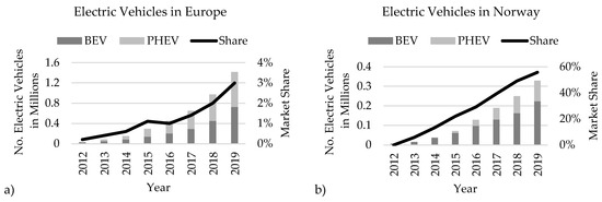 A solution to reduce costs for stationary applications is to rely on decommissioned electric vehicle (EV) batteries [17,22]. In this paper, the term EV refers to full battery electric vehicles (BEVs) as well as plug-in hybrid electric vehicles (PHEVs). BEVs mostly refer to vehicles that run entirely on electricity, while PHEVs are hybrid electric vehicles whose batteries can be recharged by external electricity sources as well as by their internal combustion engines. The average battery capacity of BEVs and PHEVs is currently around 50 kWh and 11 kWh, respectively [23]. In 2019, the total stock of EVs exceeded 7.2 million units. Based on the Sustainable Development Scenario, a global market share of 30% could be reached by 2030 [24]. BEVs and PHEVs combined now represent 3% of all vehicles sold in the European Union (EU) (Figure 2a). Norway is the global leader in EV sales based on the market share (Figure 2b), where nearly 56% of new vehicle purchases in 2019 were either hybrid or fully electric [25]. This could be a model for the EU to follow. With the rising deployment of EVs, a large number of decommissioned batteries will be available for the foreseeable future. These, in turn, offer an economic and sustainable source for stationary BESSs.